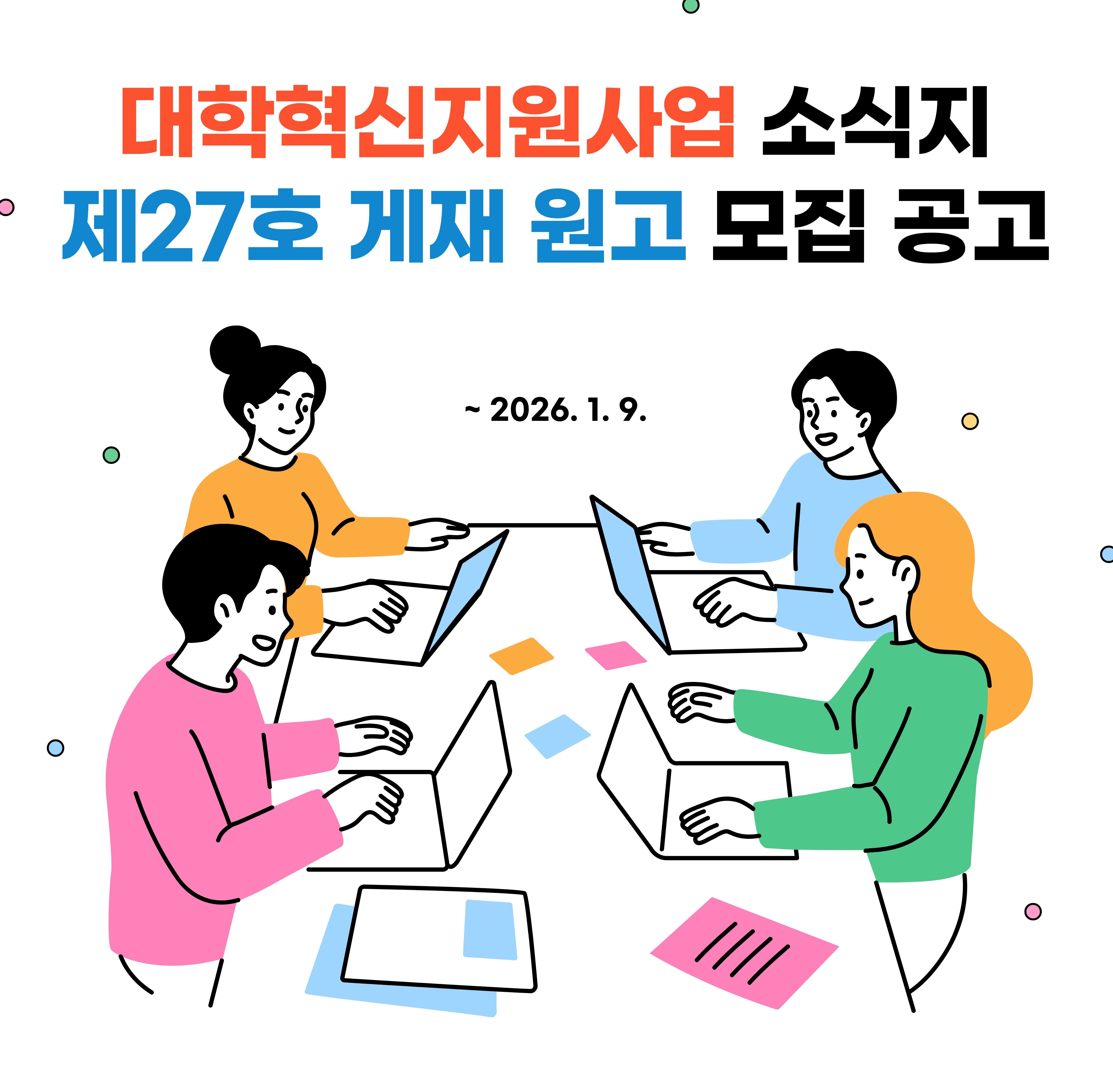 대학혁신지원사업 총괄협의회에서는 대학혁신지원사업 참여 대학 간 정보교류 및 성과 확산·홍보를 위하여 「대학혁신지원사업 소식지」 제27호 게재 원고를 모집하고 있습니다. 이에 관계자 여러분의 적극적인 참여와 협조 부탁드립니다.