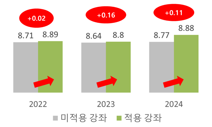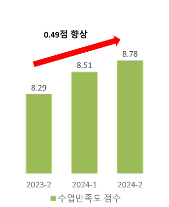 기존 ‘ABCD 따라잡기’ 1개 교과목을 ‘ABCD_A’, ‘ABCD_B’, ‘ABCD_C’, ‘ABCD_D’ 4개 교과목으로 개편한 결과, 수업 만족도 점수가 2023-2학기 8.29점 → 2024-1학기 8.51점 → 2024-2학기 8.78점으로 매학기 지속적으로 향상됨 |