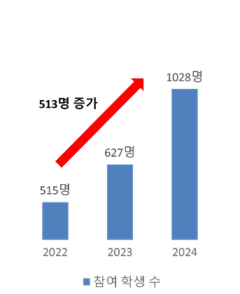 인성역량 함양을 위한 독서 프로그램(다독다독)의 운영 및 활성화를 위해 매년 지속적으로 예산을 확대하였으며, 참여 학생 수가 29명(2022) → 32명(2023) → 64명(2024)으로 증가함 |